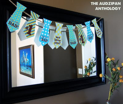 It was so easy! All I did was cut out the ties and tape them to a thick piece of hemp twine. If you are hanging your banner in front of a mirror like me, make sure you use clear tape. Then I just taped the twine to the top of the mirror and had some serious Father's Day festiveness going on!